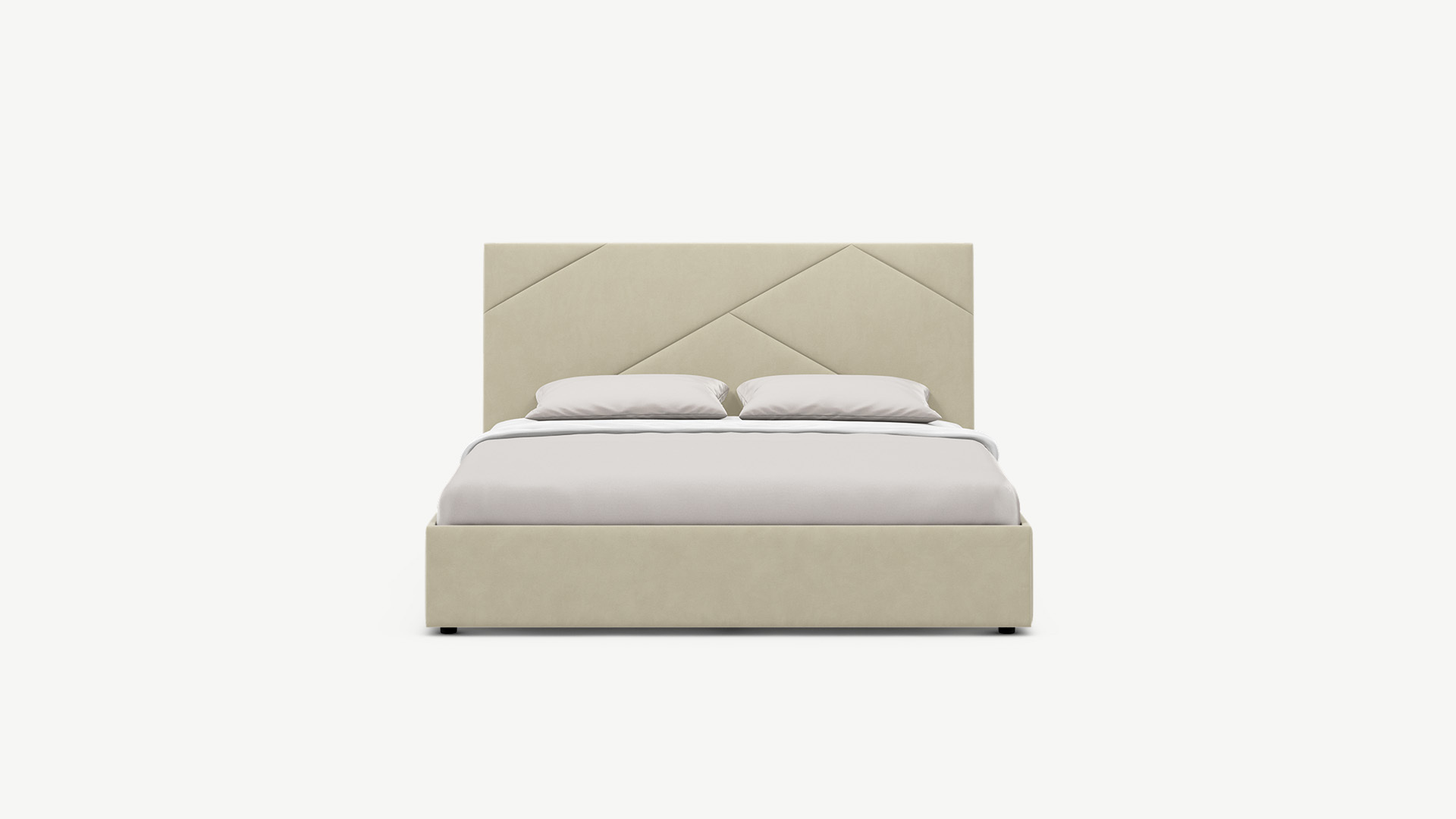 MOON FAMILY 1257 привлекает внимание оригинальным исполнением: широкие полосы ткани эффектно пересекают периметр изголовья, создавая на нем графический орнамент. Элегантным и практичным акцентом служат скрытые карманы, расположенные по его углам. Лаконичные формы объемных царг создают единый гармоничный образ и фокусируют внимание на центральном текстурном элементе кровати.