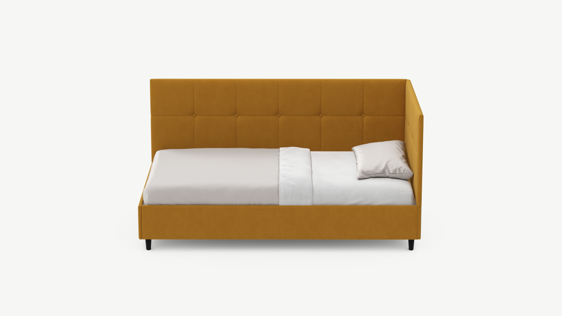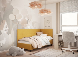 Угловая односпальная кровать MOON FAMILY 1261 с мягкой спинкой и изголовьем создаст в Вашей спальне ощущение уюта. Крупная квадратная стежка привносит в интерьер графических акцентов, а вставка из пуговиц наполняет пространство ощущением домашнего тепла.