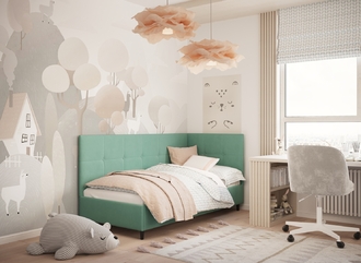 Угловая односпальная кровать MOON FAMILY 1261 с мягкой спинкой и изголовьем создаст в Вашей спальне ощущение уюта. Крупная квадратная стежка привносит в интерьер графических акцентов, а вставка из пуговиц наполняет пространство ощущением домашнего тепла.