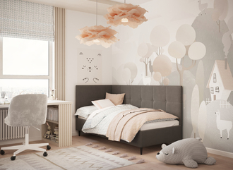 Угловая односпальная кровать MOON FAMILY 1261 с мягкой спинкой и изголовьем создаст в Вашей спальне ощущение уюта. Крупная квадратная стежка привносит в интерьер графических акцентов, а вставка из пуговиц наполняет пространство ощущением домашнего тепла.