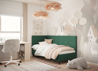 Угловая односпальная кровать MOON FAMILY 1261 с мягкой спинкой и изголовьем создаст в Вашей спальне ощущение уюта. Крупная квадратная стежка привносит в интерьер графических акцентов, а вставка из пуговиц наполняет пространство ощущением домашнего тепла.