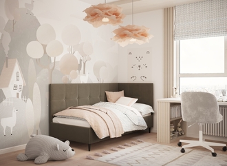 Угловая односпальная кровать MOON FAMILY 1261 с мягкой спинкой и изголовьем создаст в Вашей спальне ощущение уюта. Крупная квадратная стежка привносит в интерьер графических акцентов, а вставка из пуговиц наполняет пространство ощущением домашнего тепла.