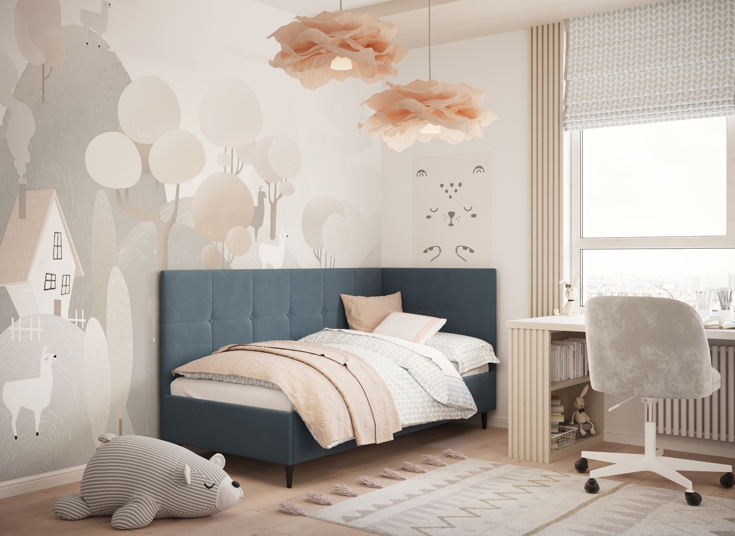 MOON FAMILY 1261 объединяет функциональность и стиль, создавая гармоничное пространство для отдыха и творчества. Кровать доступна в левостороннем и правостороннем исполнении, что позволяет легко адаптировать ее под любые интерьерные особенности.