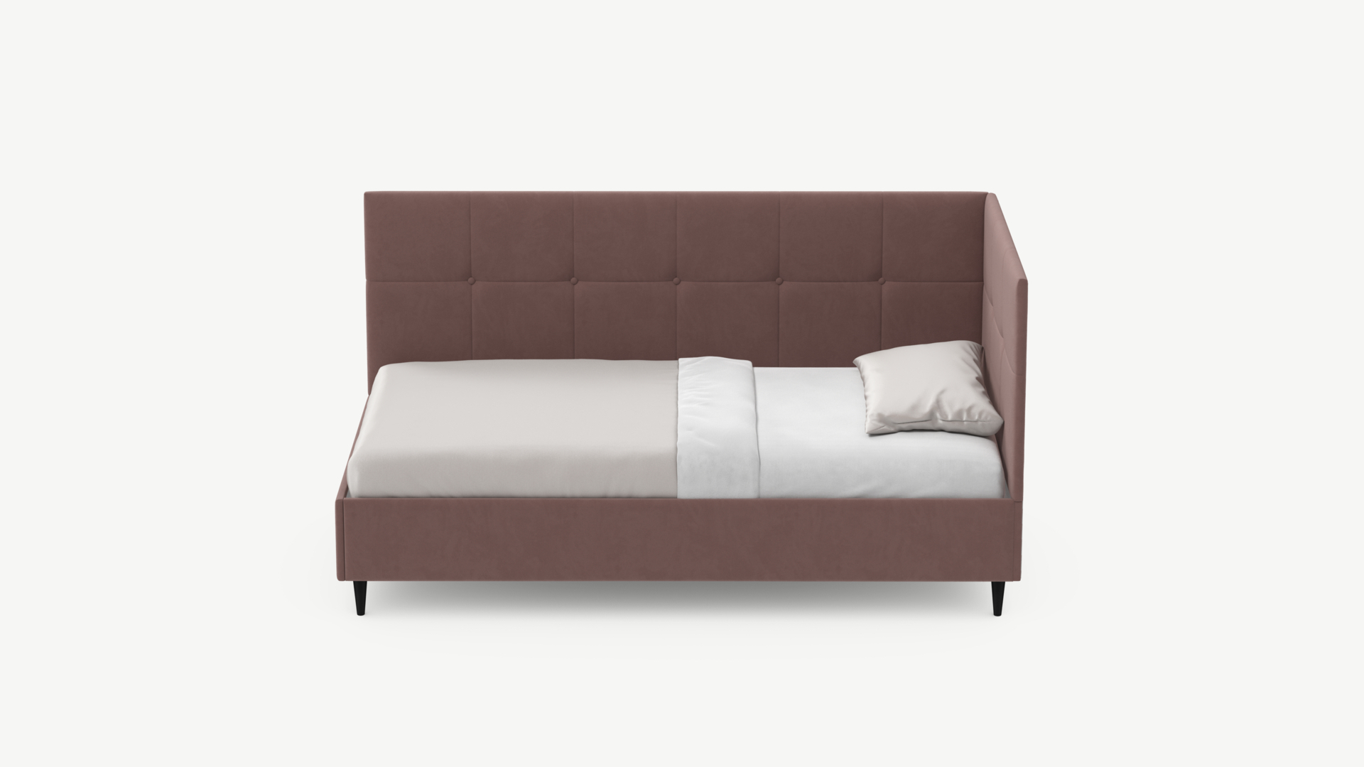 Угловая односпальная кровать MOON FAMILY 1261 с мягкой спинкой и изголовьем создаст в Вашей спальне ощущение уюта. Крупная квадратная стежка привносит в интерьер графических акцентов, а вставка из пуговиц наполняет пространство ощущением домашнего тепла.