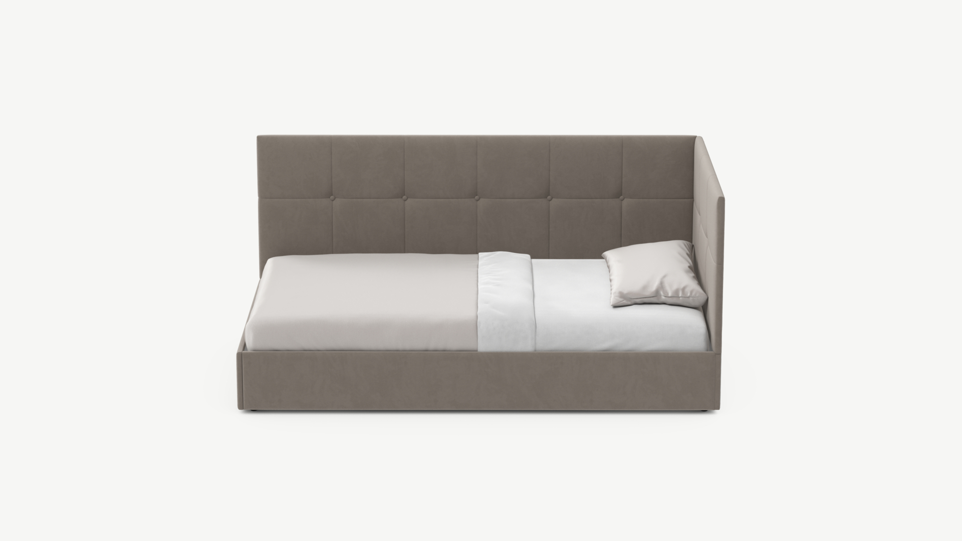 Угловая односпальная кровать MOON FAMILY 1261 с мягкой спинкой и изголовьем создаст в Вашей спальне ощущение уюта. Крупная квадратная стежка привносит в интерьер графических акцентов, а вставка из пуговиц наполняет пространство ощущением домашнего тепла.